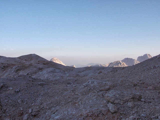 Wkrótce przychodzi nam zobaczyć otoczenie Velskiej Doliny, a więc od lewej Miselj Vrh, Na Nizkem, Miseljska Glava i ucięty Miseljski Konec. Poniżej Smarjetna Glava, jak widać wszystkie znajdują się mniej więcej na naszej wysokości - jesteśmy więc na około 2350-2400 m.n.p.m...
