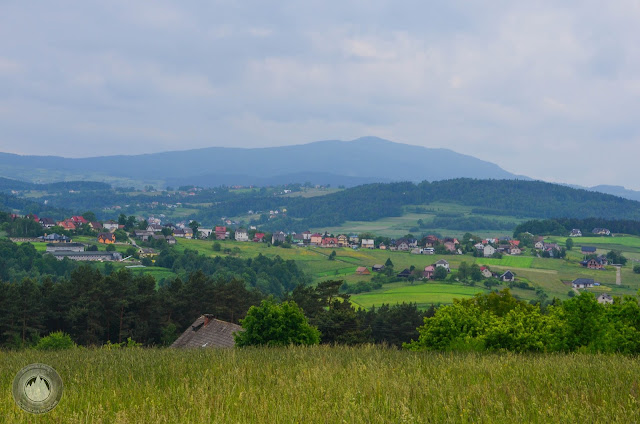Z miasta wyprowadzają mnie dwa szlaki - zielony i niebieski. Najpierw przebijam się przez grupkę niskich bloków, a potem lokalną drogą pnę się na okoliczne wzgórza, ograniczające od południa Limanową, z których doskonale prezentuje się całe Pasmo Łososińskie. Ono już za mną.